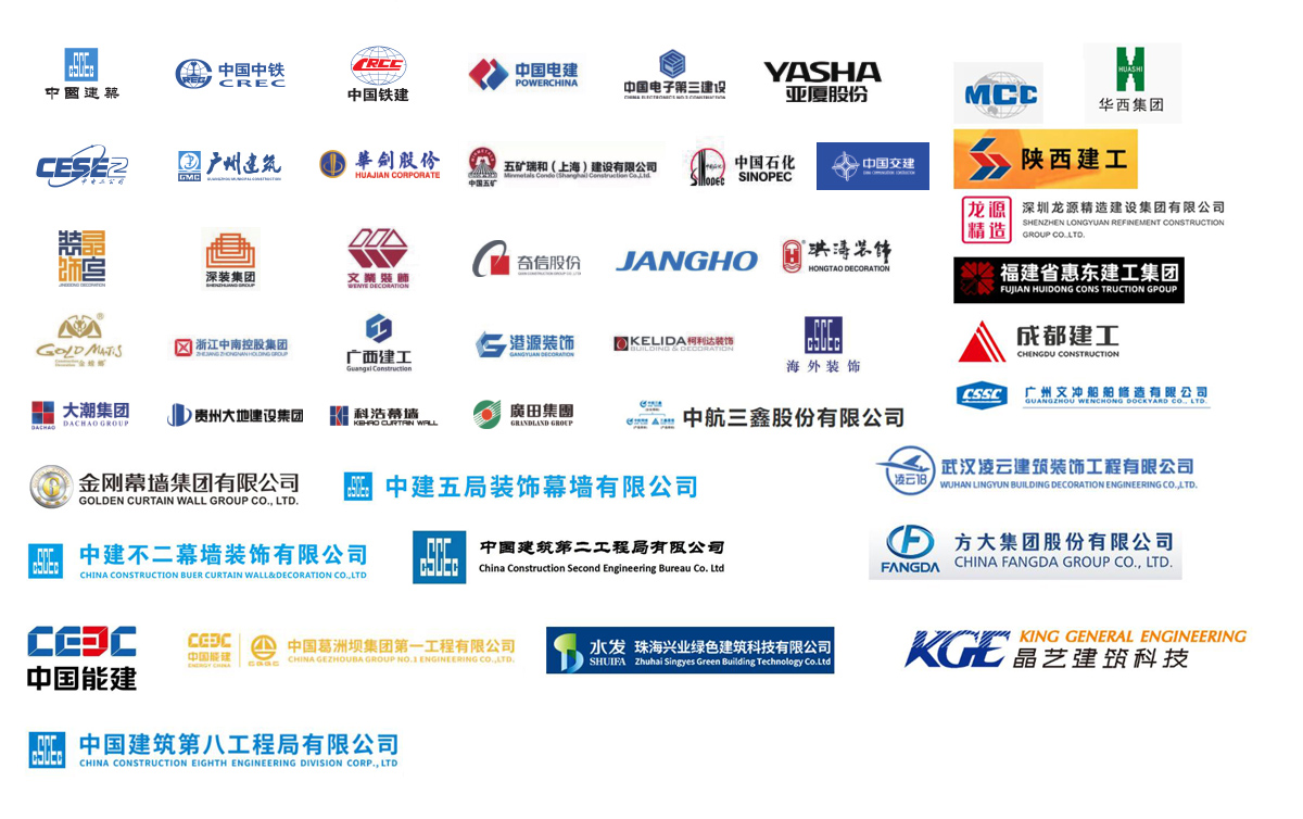 公司參建了諸多大型項(xiàng)目工程,如港珠澳大橋、珠海國際航展、深圳國際會(huì)展中心、廣州白云機(jī)場、西安全運(yùn)會(huì)場館、成都東安湖大運(yùn)會(huì)場館、樂山奧體中心、洛陽奧體中心、增城富士康廠房、惠州中海油、陽江核電站、珠三角各地鐵線、高鐵站、廣西桂林機(jī)場、廣西柳州文化廣場、四川成都天府機(jī)場、海南海口美蘭機(jī)場、西安絲路會(huì)展中心、惠州北站等等。與中國建筑、中國中鐵、中國鐵建、中國電建、中國交建、中國中冶、中國能建、廣東建筑、廣西建工、廣州建筑等大型國有企業(yè)下屬公司及江河幕墻、金螳螂裝飾等各大建筑裝飾、幕墻裝飾公司達(dá)成長期友好合作關(guān)系。